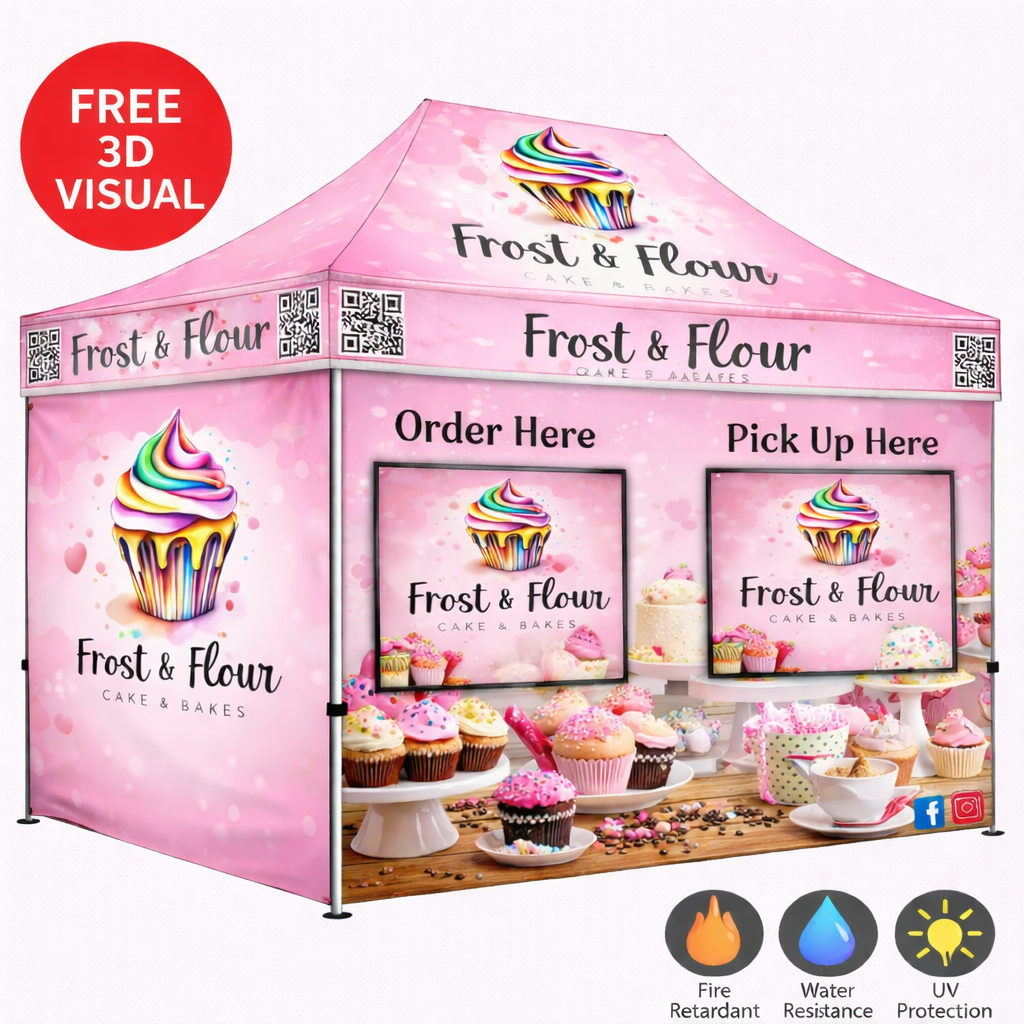 🎨 Impresión personalizada: Impresión por sublimación de tinta a todo color en la parte superior del toldo, la pared trasera completa y la mitad de las paredes laterales para obtener gráficos vibrantes y resistentes a la decoloración.