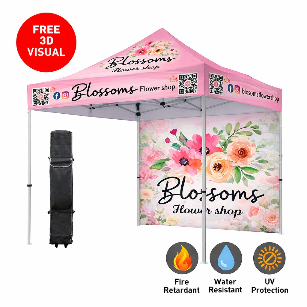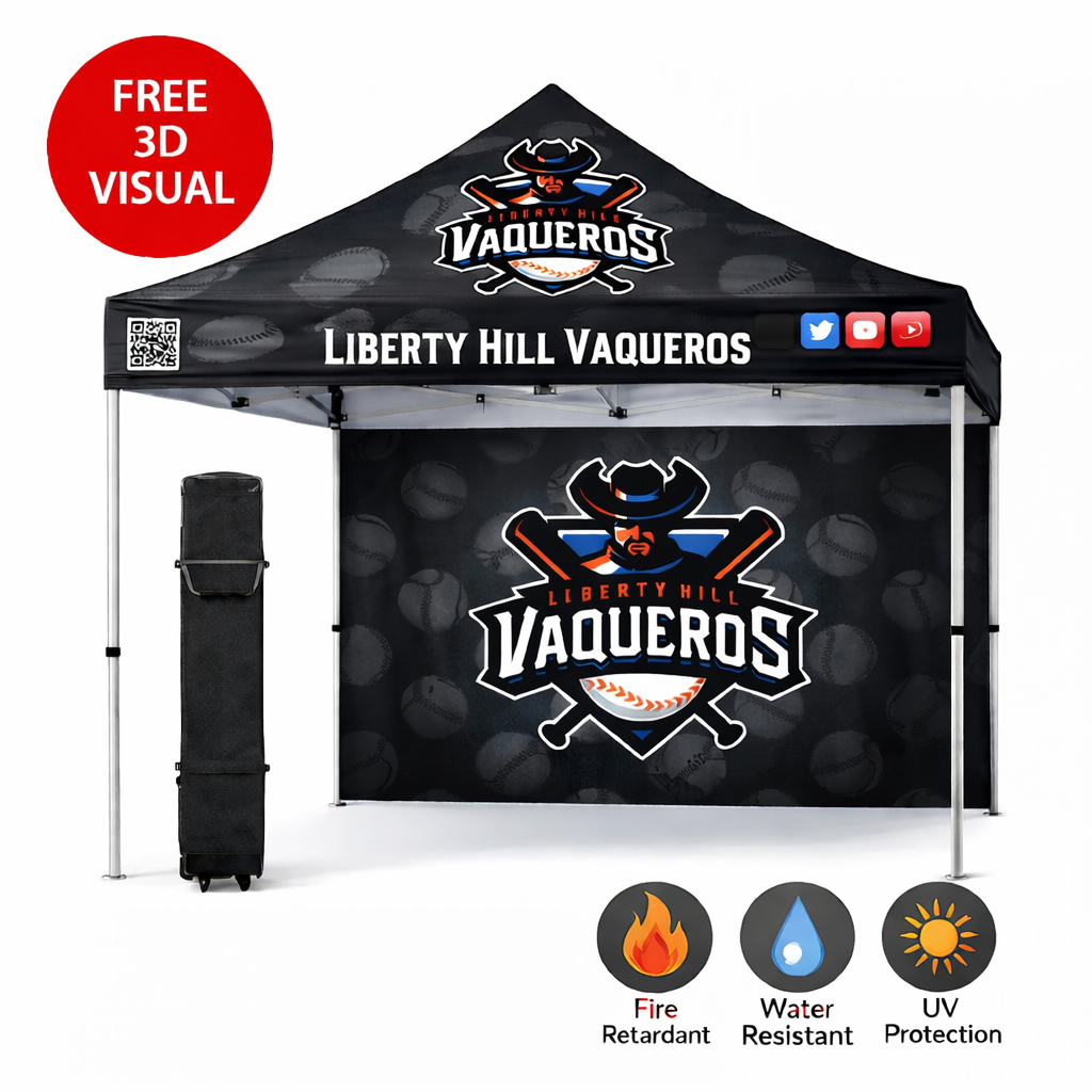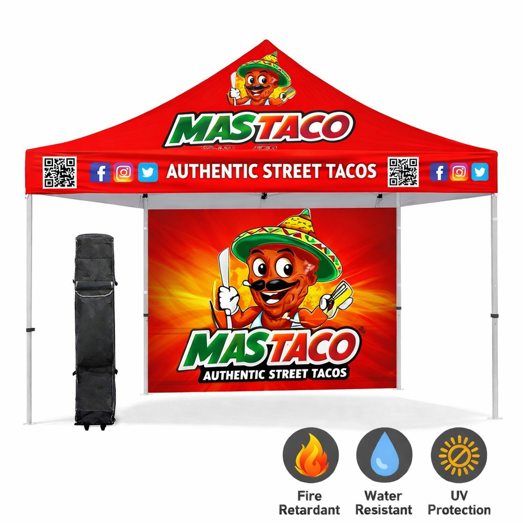 Carpa personalizada Premium 10x10 – Estructura hexagonal de aluminio (plateada) con pared trasera completa y faldón de 17" (Impresión por sublimación de tinta)