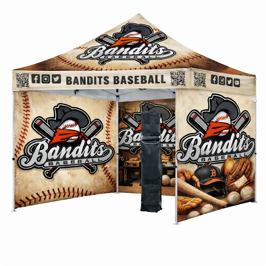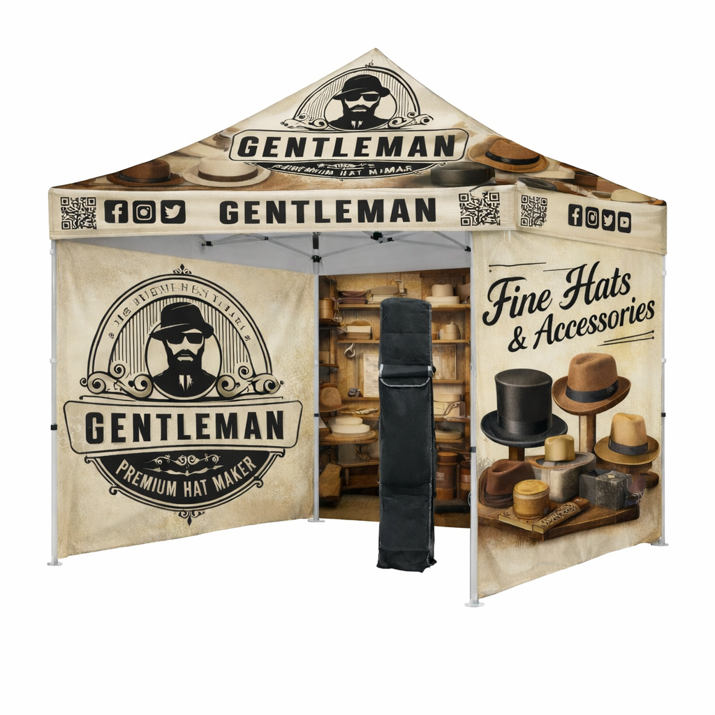Carpa personalizada Premium 10x10 – Estructura hexagonal de aluminio (plateada) con tres paredes completas y faldón de 17" (Impresión por sublimación de tinta)