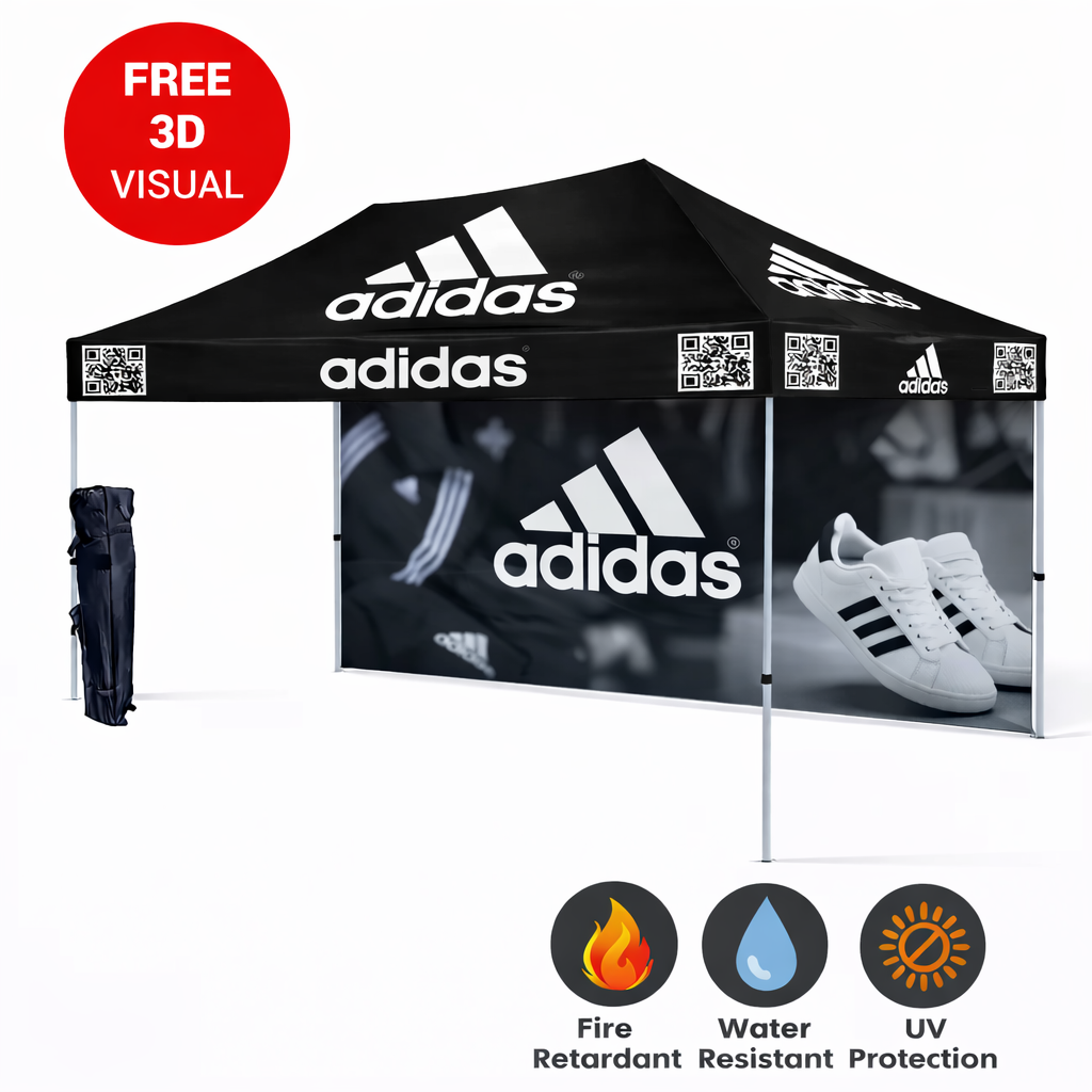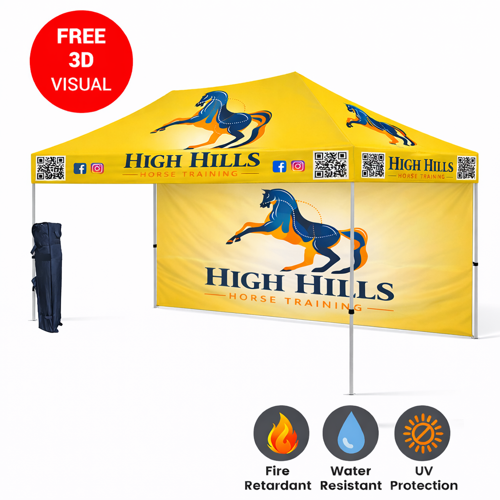 Carpa personalizada Premium 10x15 – Estructura hexagonal de aluminio (plateada) con pared trasera completa y faldón de 17" (Impresión por sublimación de tinta)