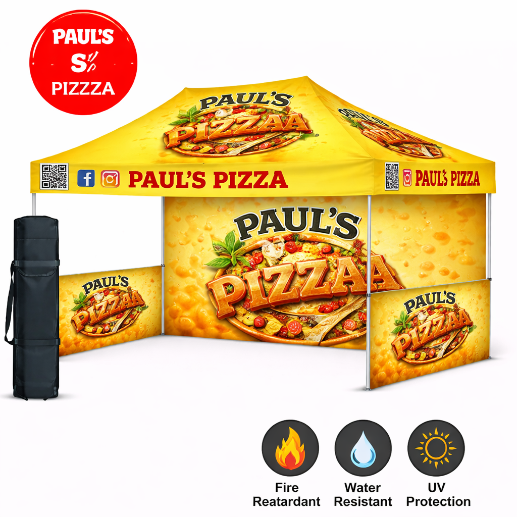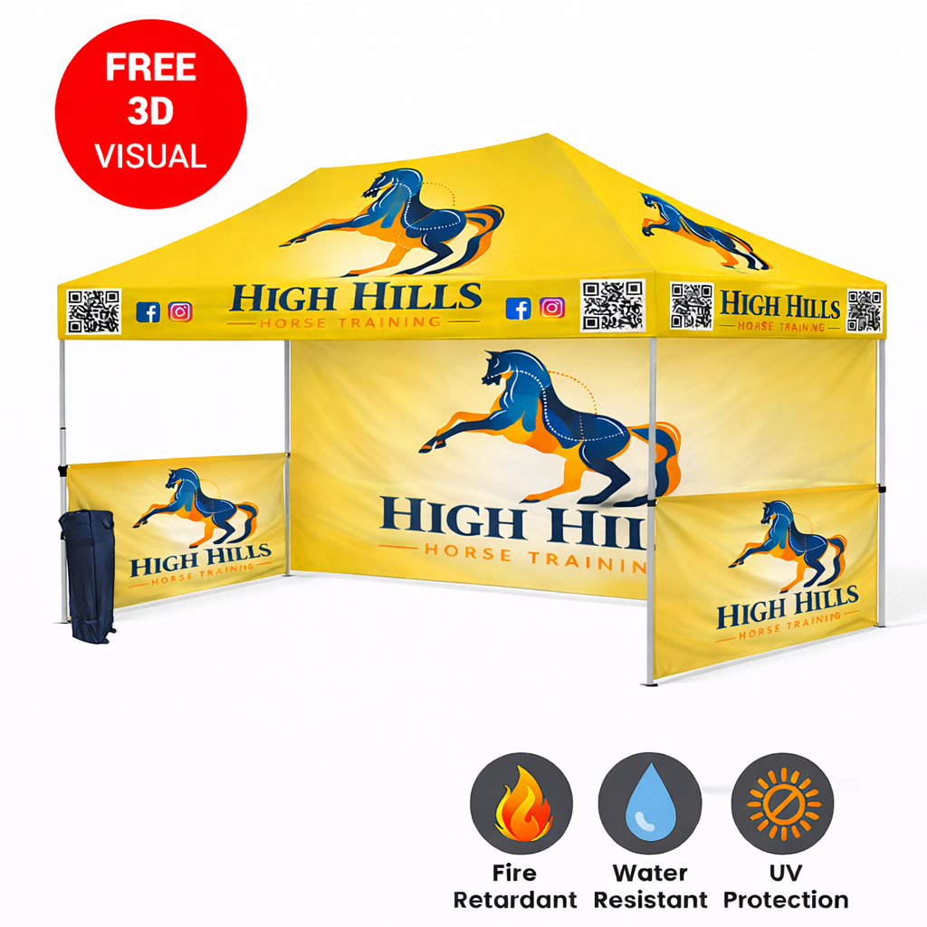 Carpa personalizada Premium 10x15 – Estructura hexagonal de aluminio (plateada) con pared trasera completa, dos medias paredes laterales y faldón de 17" (Impresión por sublimación de tinta)